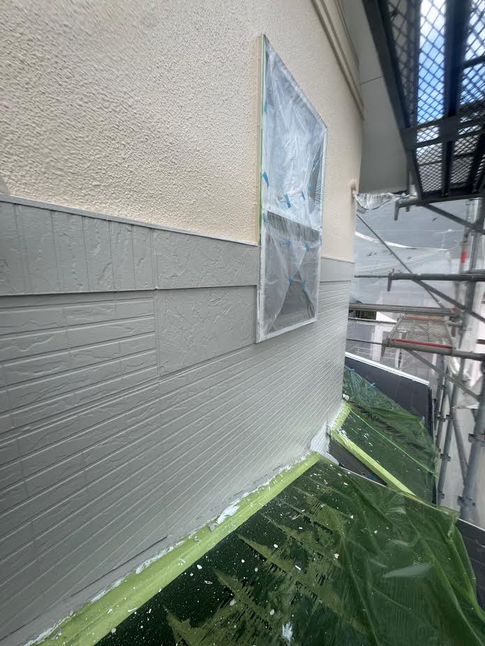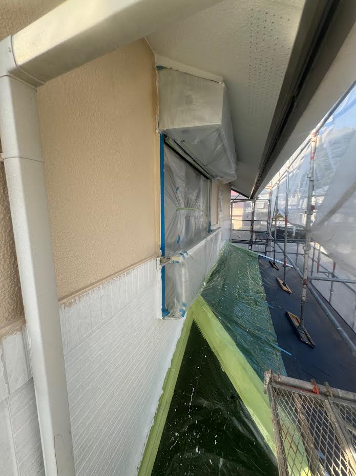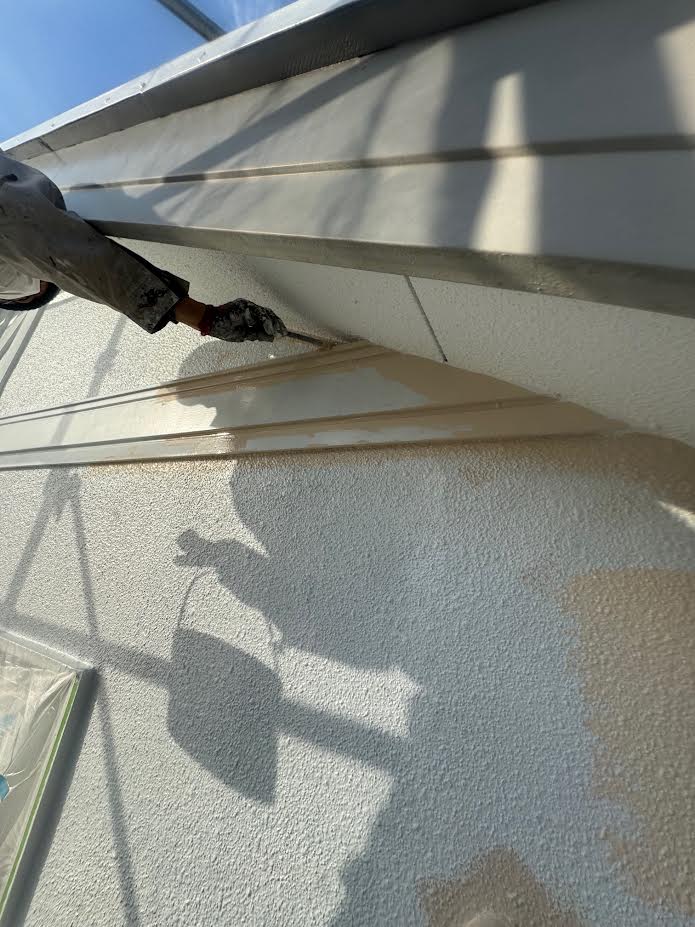 ↓の写真をご覧ください。(2階外壁モルタル部分の塗装中に撮影しています。)