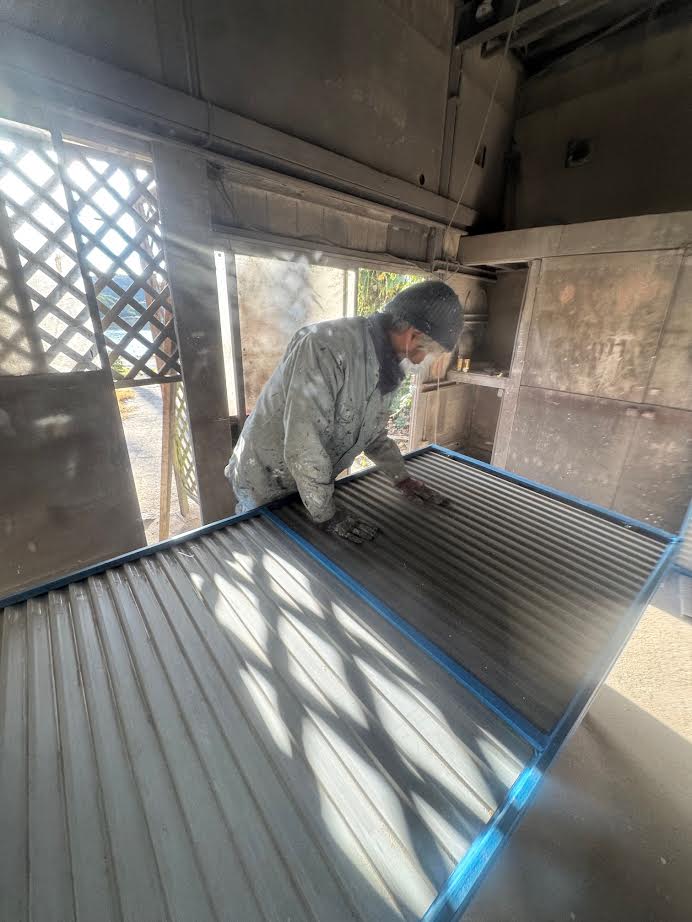 今日は長崎市新小が倉町の、お施主様よりお預かりしている雨戸のケレン作業(表面をキレイにする作業)を行いました。
