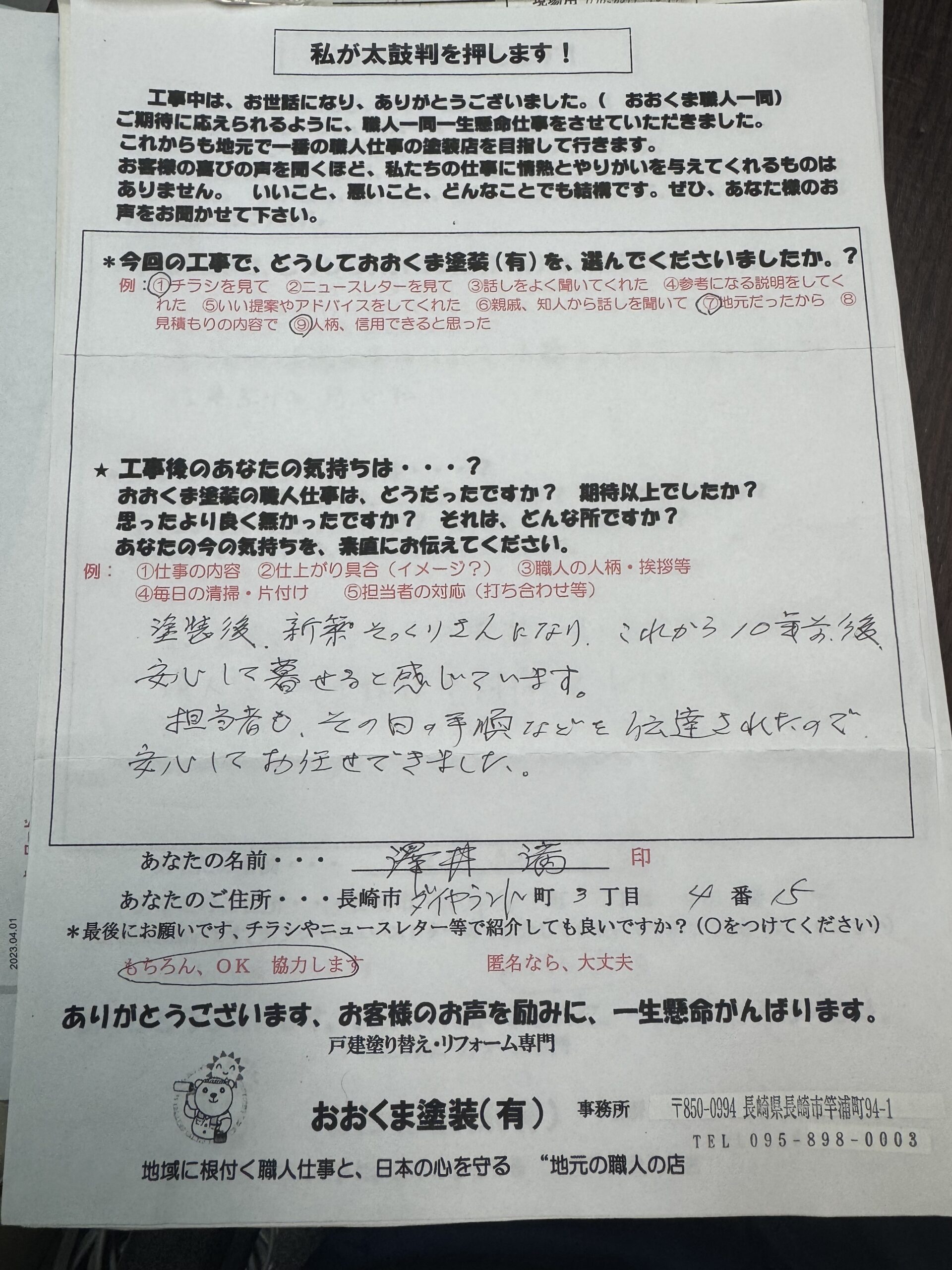 当社の選択理由がチラシという事もあり、チラシの重要性を我々も再認することができました。塗装工は、塗装をしてからが本当のお付き合いの始まりですので、これからも、何か気になったことが出てきましたらなんなりとご連絡くださいね。これからもどうぞよろしくお願い申し上げます。」